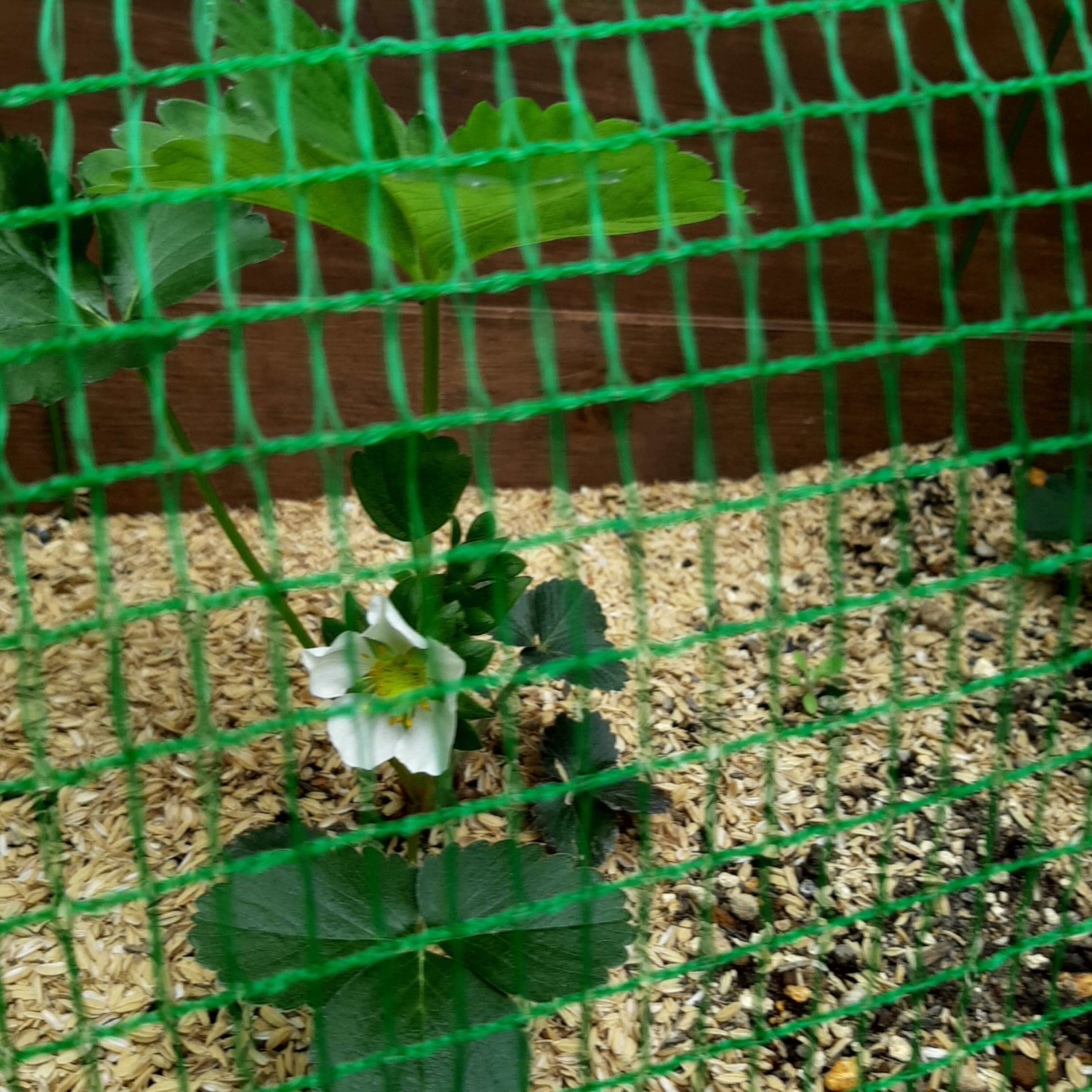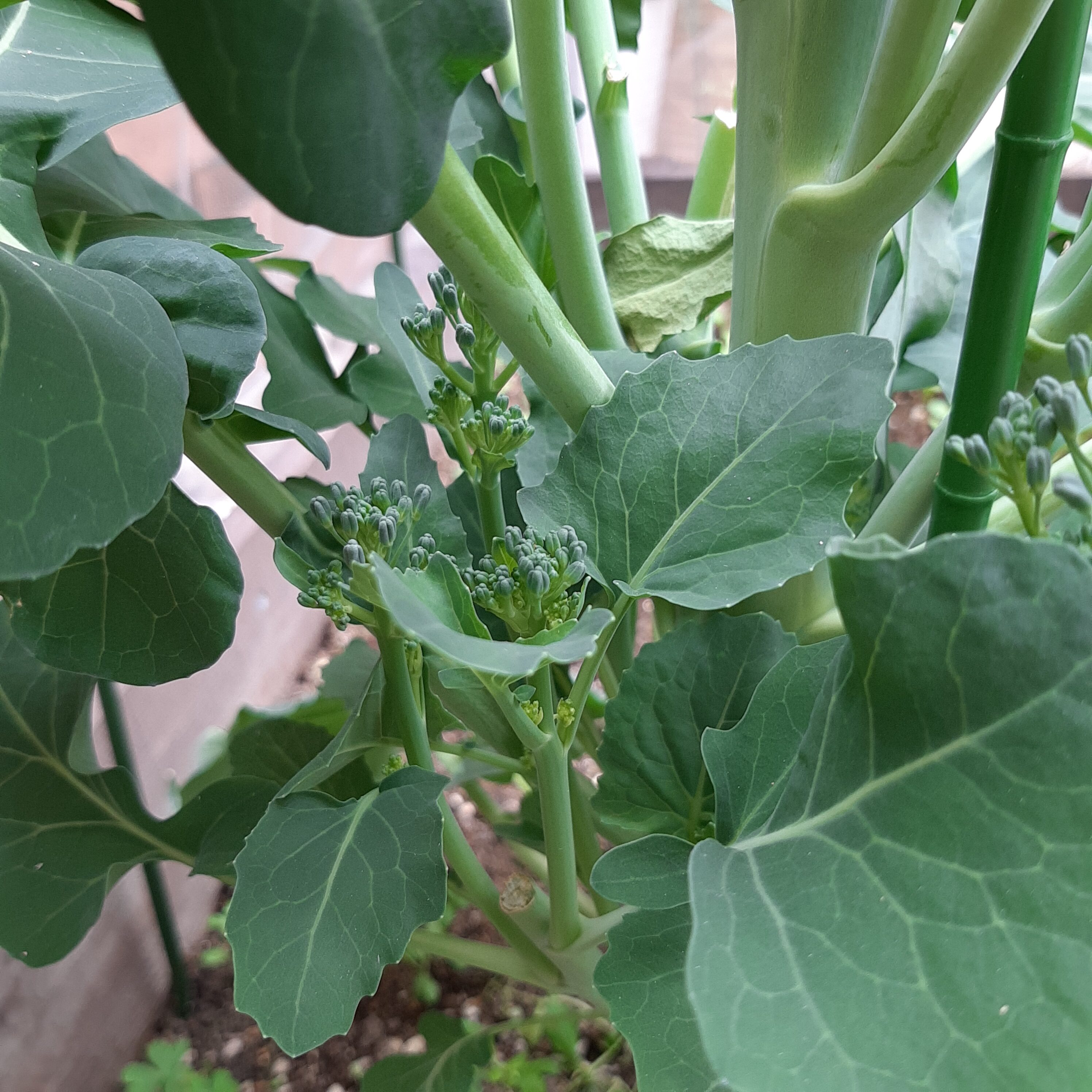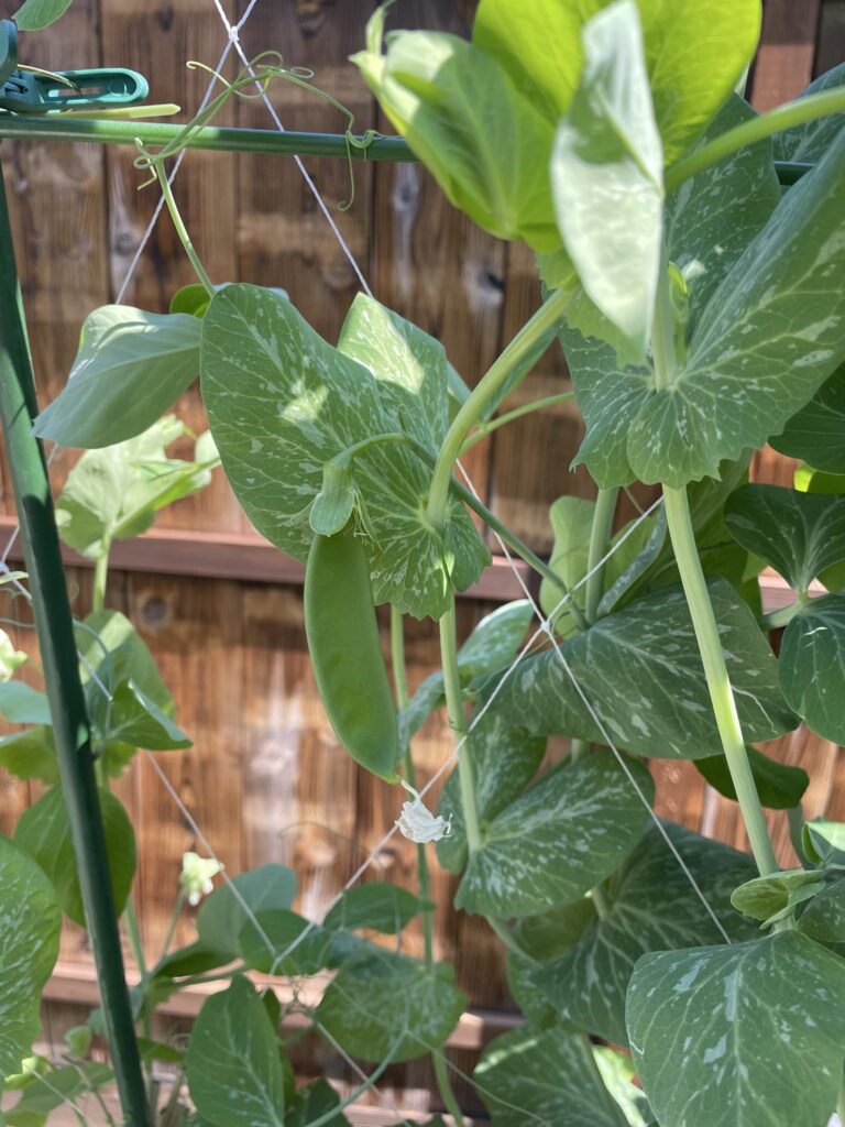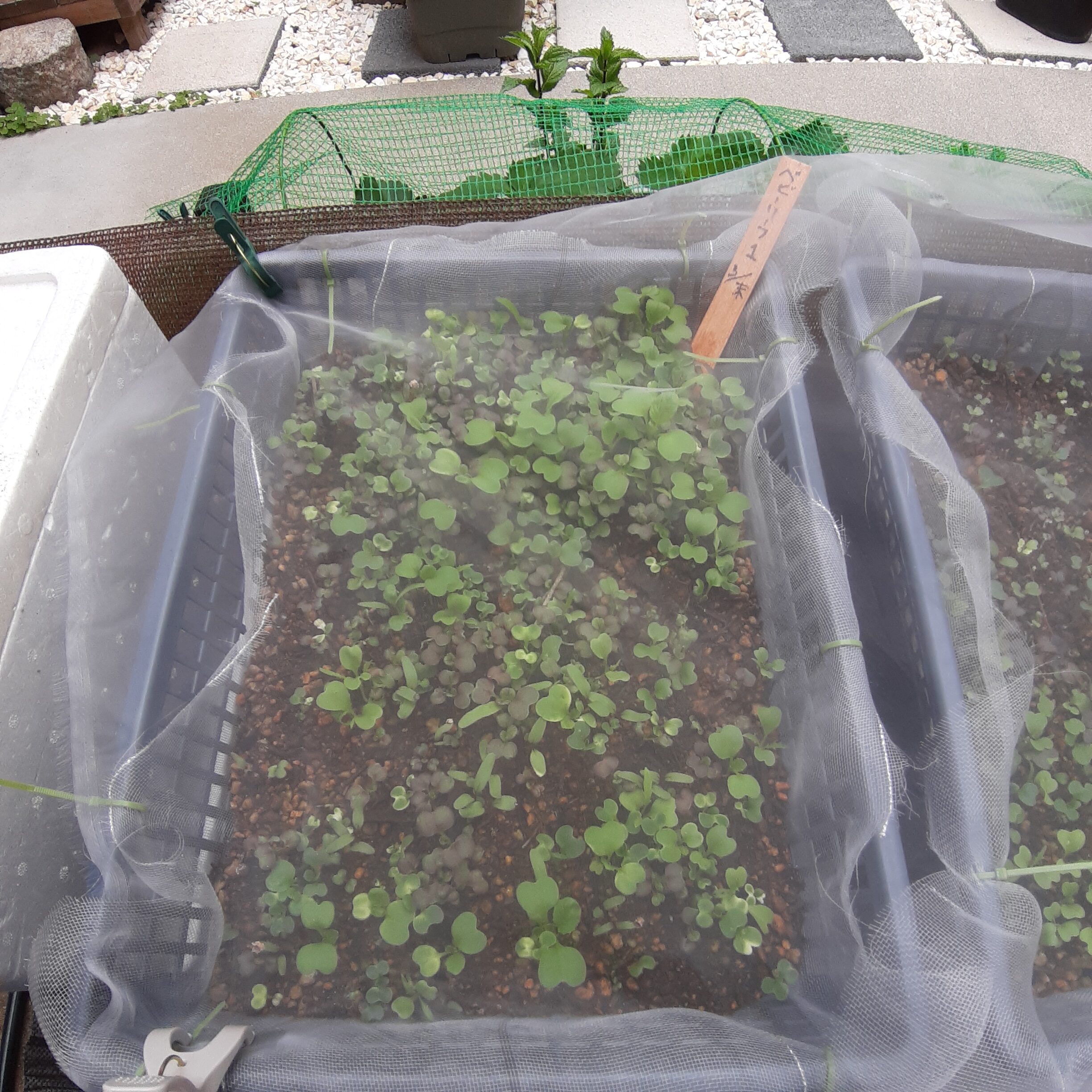 玄関前の中庭です。あたたかい日差しの中、きぬさやが勢いよく育っています。