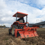 左上より、トラクターでの土壌の開梱作業、堆肥まき、大根の種まき、大根の害虫駆除(無農薬)。下段、レンゲ草の種まき、畑一面に咲いたレンゲ草(後に土壌を肥やす肥料となります)、すくすく育つ白菜、キャベツの収穫。