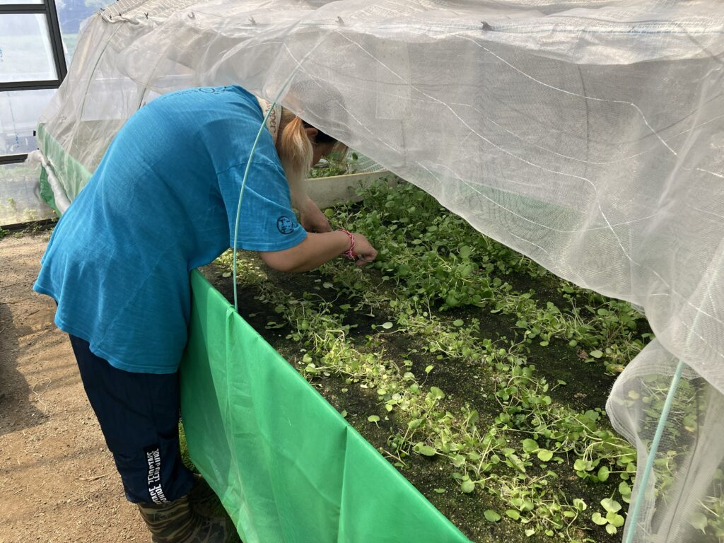 防虫ネットで囲われたクレソン。丁寧に栽培、収穫されます。