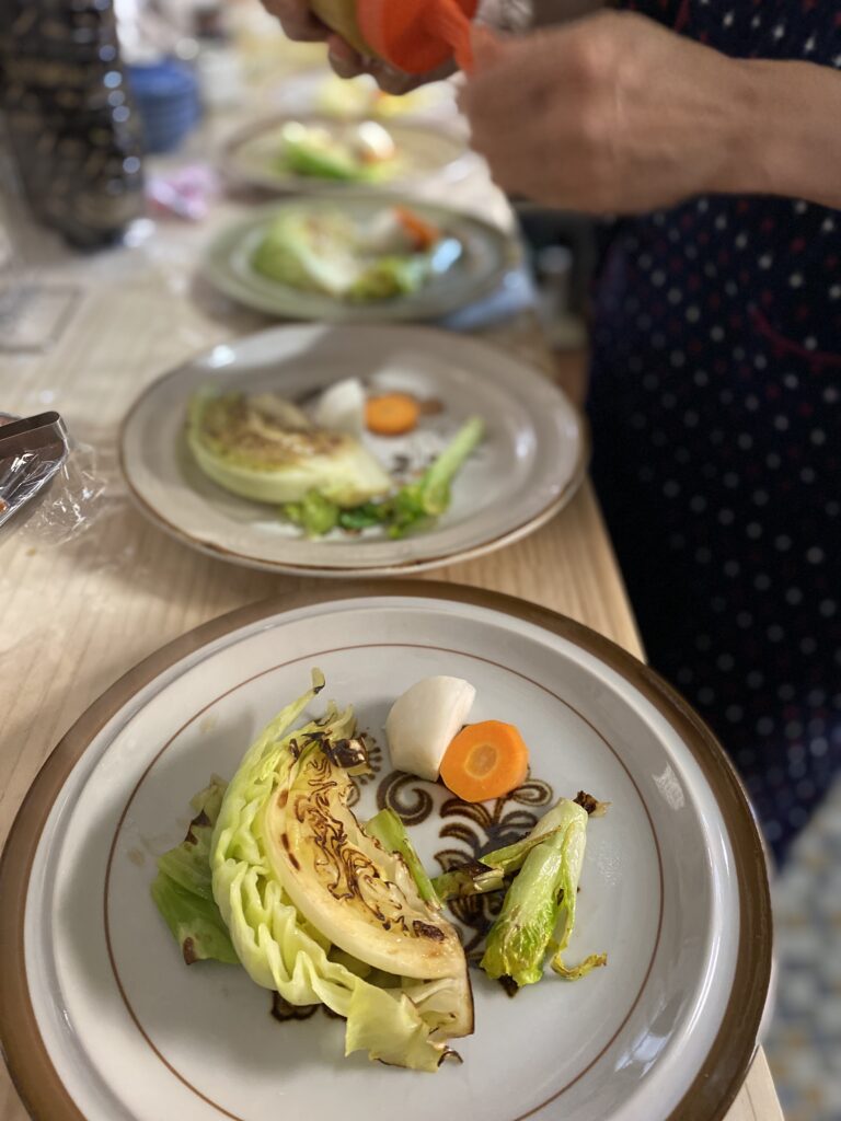 厨房での写真です。野菜の素材の美味しさを味わって頂ける焼き野菜などの、まるごと野菜メニュー。特性ドレッシングを待つお皿達。